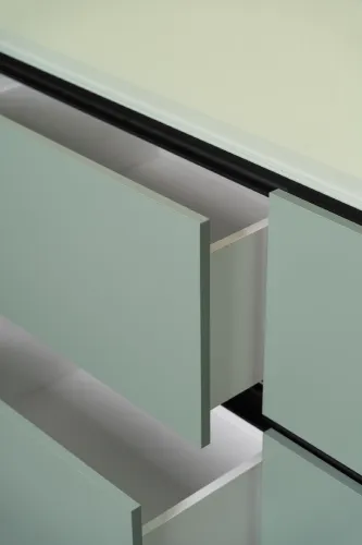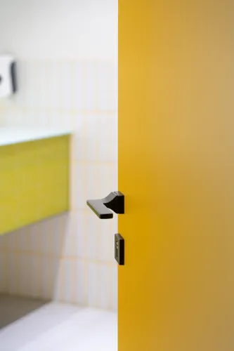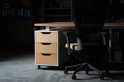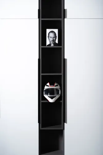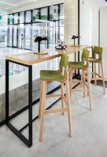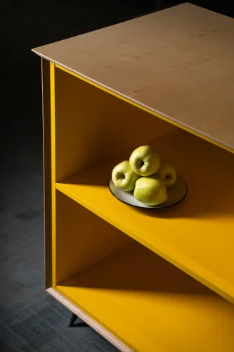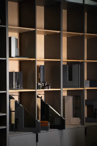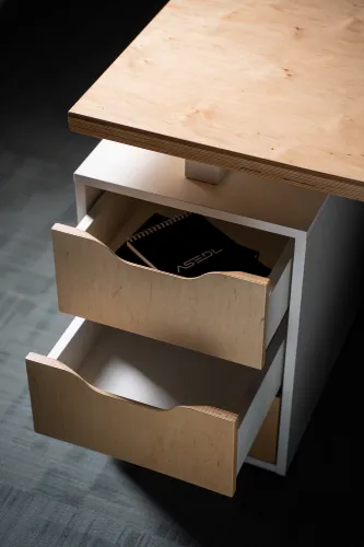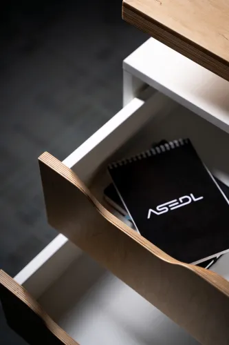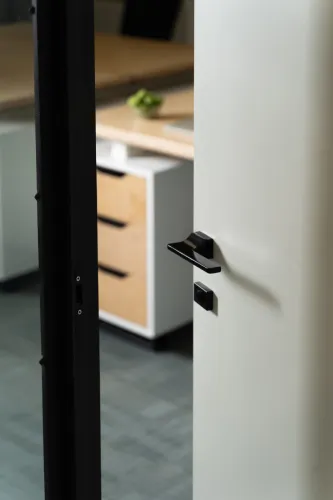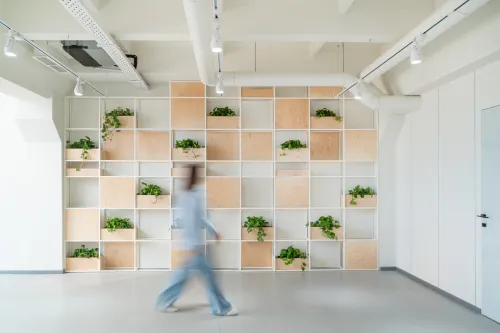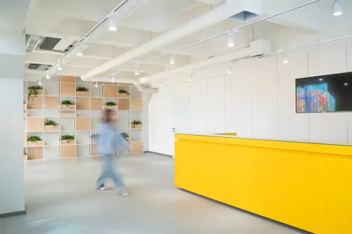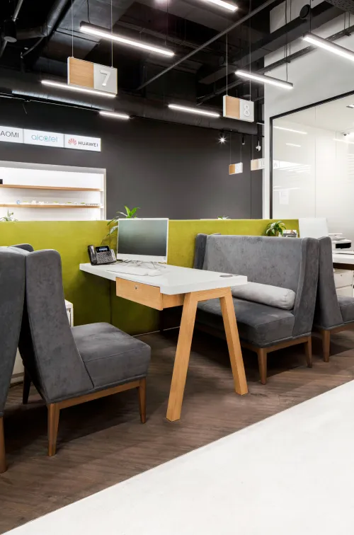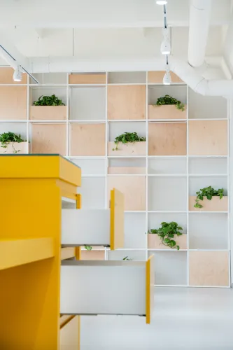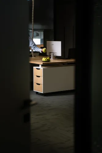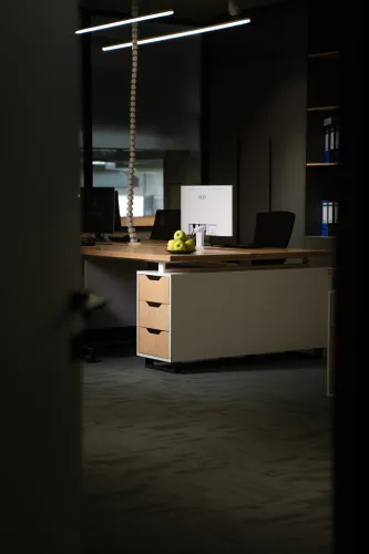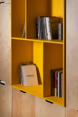 The project was implemented in 2023 and involved extensive, detailed work, using materials such as plywood, metal, veneered, and painted MDF, among others. It is distinguished by the use of practical constructions and a modular design, allowing for easy reconfiguration of the space to accommodate various functions and work requirements.